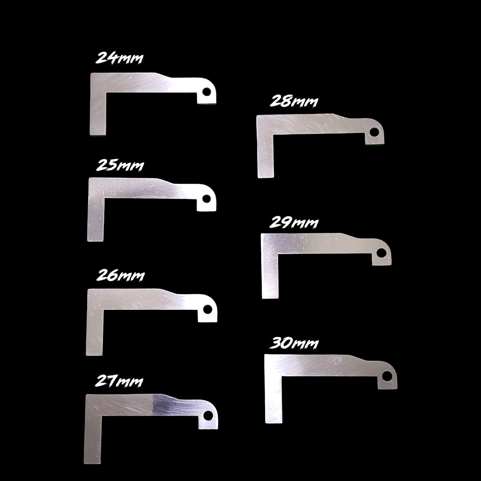 – (14x) POLYMER PET-CF TEST FORCED RESET LEVERS (2 OF EACH 24mm TO 30mm) (ALLOWS FOR INITIAL TEST FITTING WHICH CAN THEN BE CLONED TO YOUR METAL LEVER